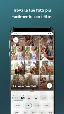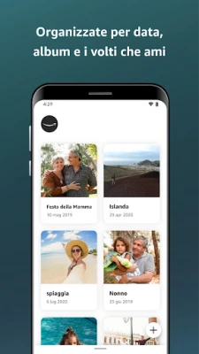 Oltre a una custodia impeccabile, Amazon Photos rende la condivisione un gioco da ragazzi. Invia facilmente album o singole immagini ad amici e familiari tramite SMS, email o qualsiasi altra applicazione di messaggistica preferita. Scopri la comodità di un backup online fornito da Amazon, progettato per offrirti serenità e un'esperienza utente fluida. Amazon Photos è la tua soluzione definitiva per conservare, organizzare e condividere le tue storie visive più importanti, direttamente dal palmo della tua mano.